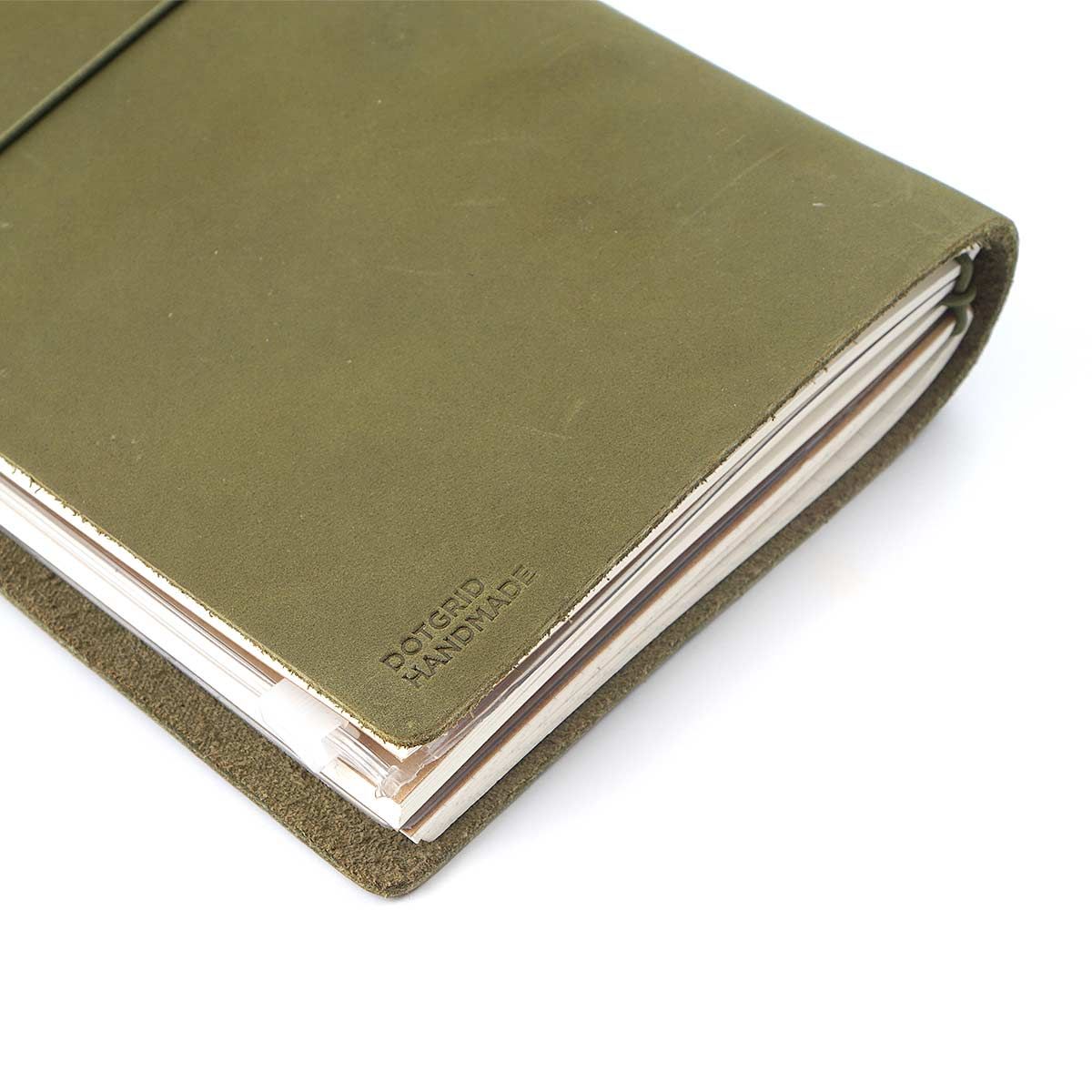 Sổ tay bìa da Dot Grid Olive Edition với bìa bằng da thật màu xanh olive lấy cảm hứng từ thảo nguyên xanh mát.Có kích thước hoàn hảo, thuận tiện trong việc mang theo trong những chuyến đi. Bạn có thể bỏ vừa bản đồ, vé và các vật dụng cần thiết khác trong cuốn sổ tay này.